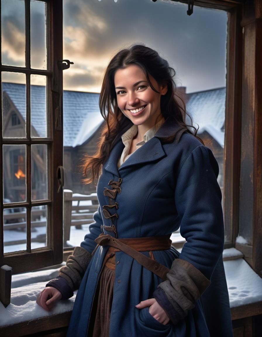 This image shows a dark-haired woman in a snow-covered coat and skirt smiling as she speaks with a blacksmith near a forge. The scene is bathed in warm colors and illuminated by dynamic, natural lighting in a Renaissance style.