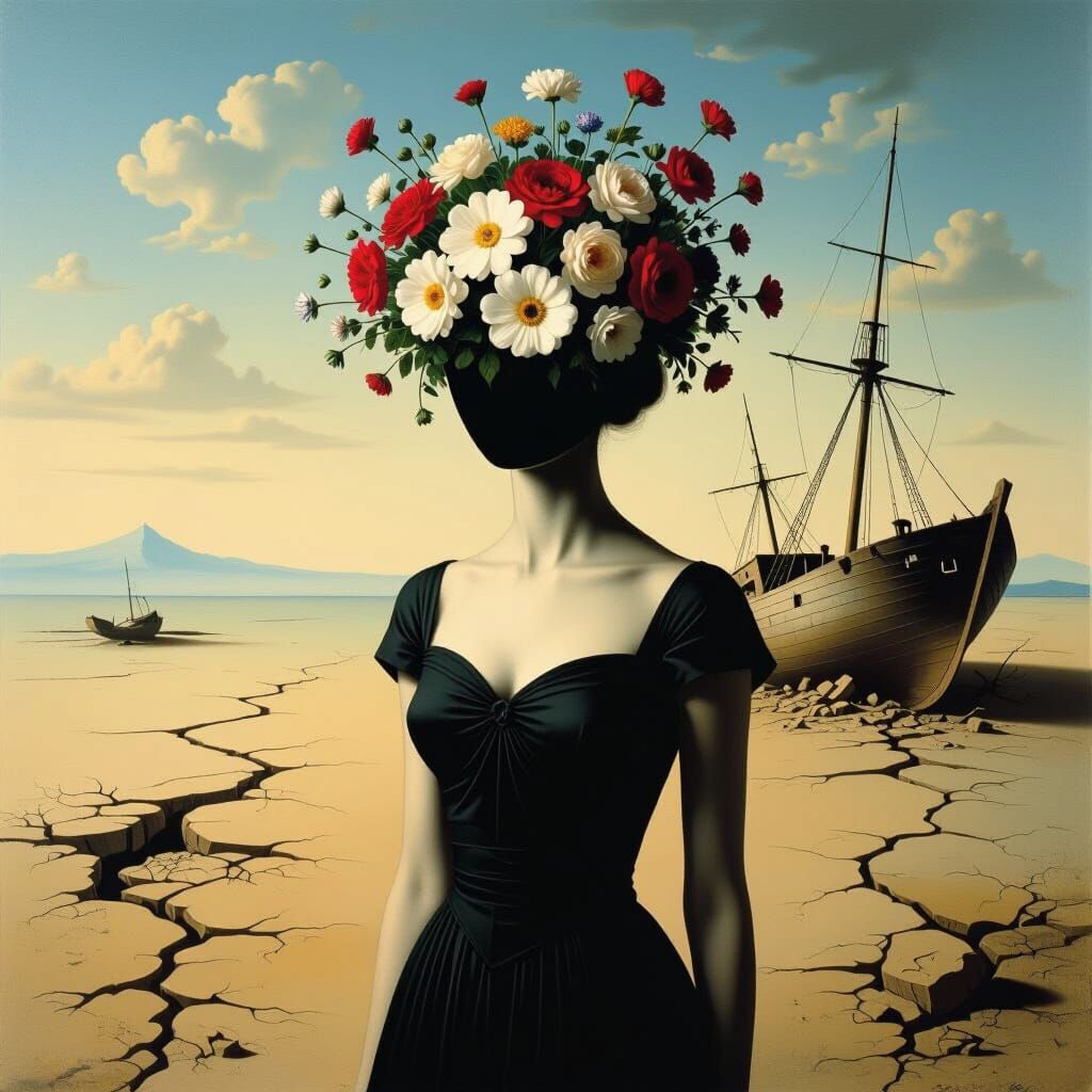 A striking picture of a slender woman's silhouette, her head replaced by a delicate bouquet. This surreal image features a desolate landscape with a wrecked ship in the background, in an ethereal surrealist style.