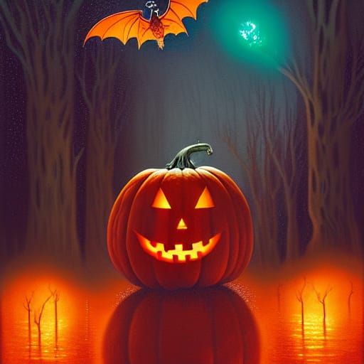 A glowing orange pumpkin in a spooky, hyperdetailed painting. This digital illustration features bats, colorful sparkles, and dynamic lighting in an eldritch style.