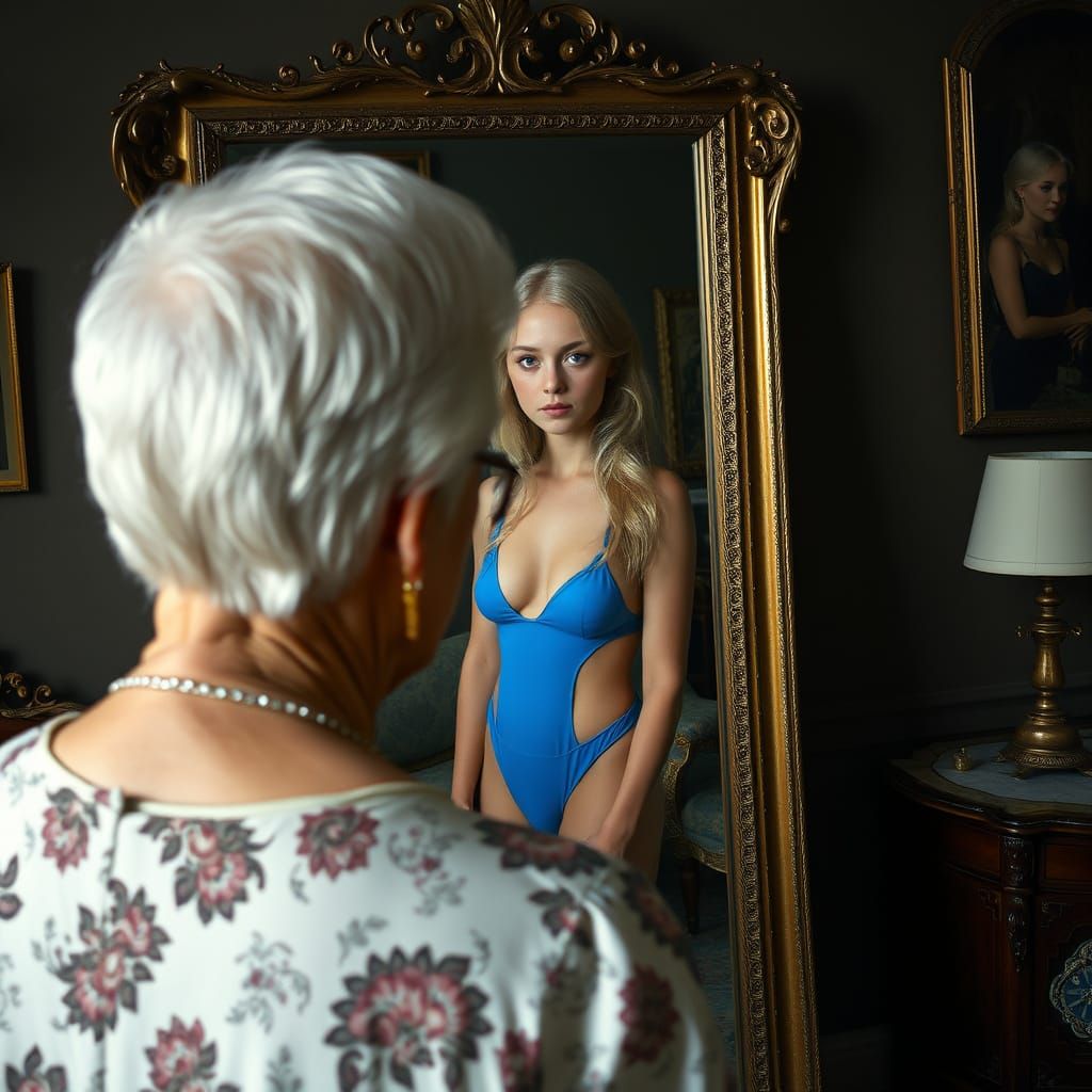 This image shows an elderly woman standing before a mirror. Her reflection reveals a young girl in a swimsuit. The artwork is rendered in a photorealistic style with precise details and subtle lighting.