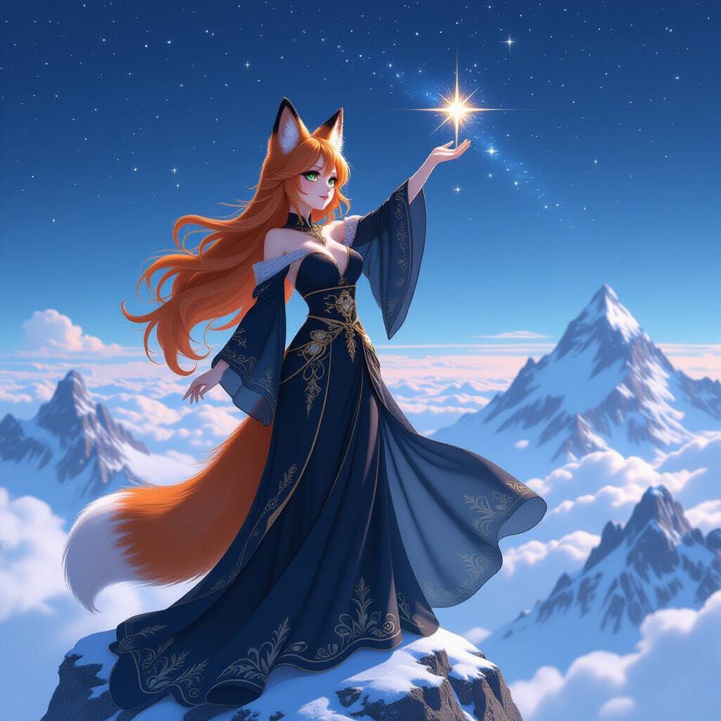 This image shows a serene fox-girl in a celestial gown on a mountain peak. She is reaching for the starlit sky in this ethereal 3D anime art piece, rendered with ultrafine detail.