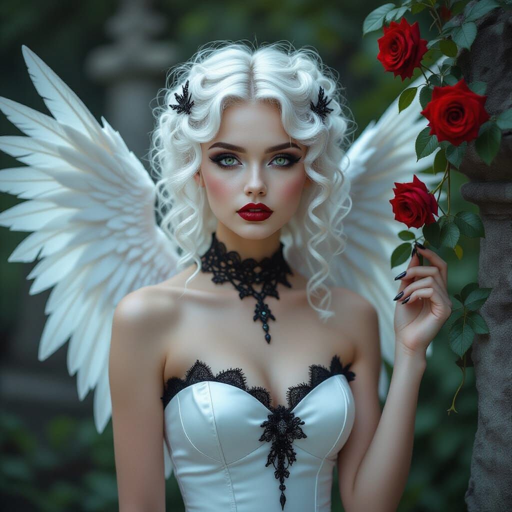 This image depicts a pale woman with white curly hair and feathered wings, wearing a gothic dress and necklace, holding red roses. Features dark makeup and a graveyard backdrop. Cinematic, highly detailed, romantic gothic aesthetic.