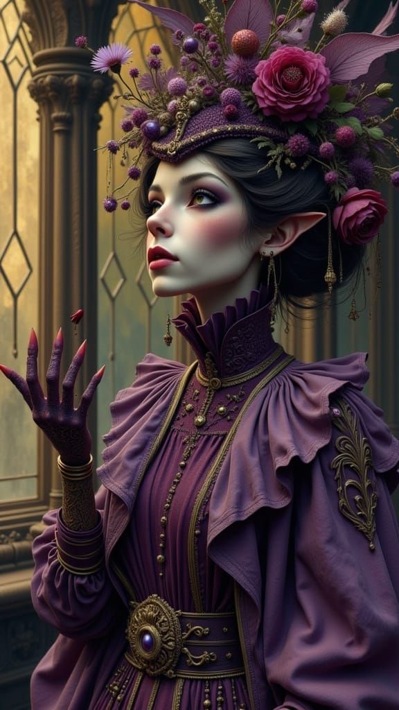 This image shows an enigmatic Edwardian fae woman with floral elements in her hair, set in a dimly lit cathedral. Rendered in a surreal, mixed-media ink-wash art style with ethereal brushstrokes and dramatic lighting.