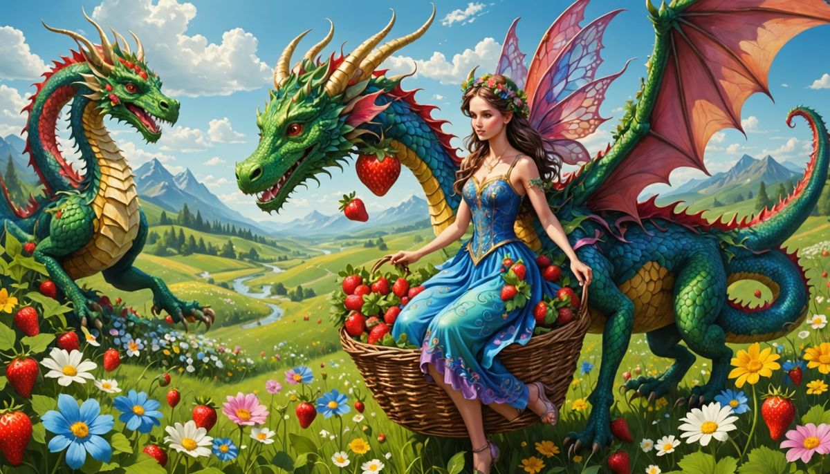 This abstract vector fractal image depicts a fairy in a vibrant dress and a helpful dragon gathering strawberries in a field, rendered with 3D shading and intricate Zentangle patterns.