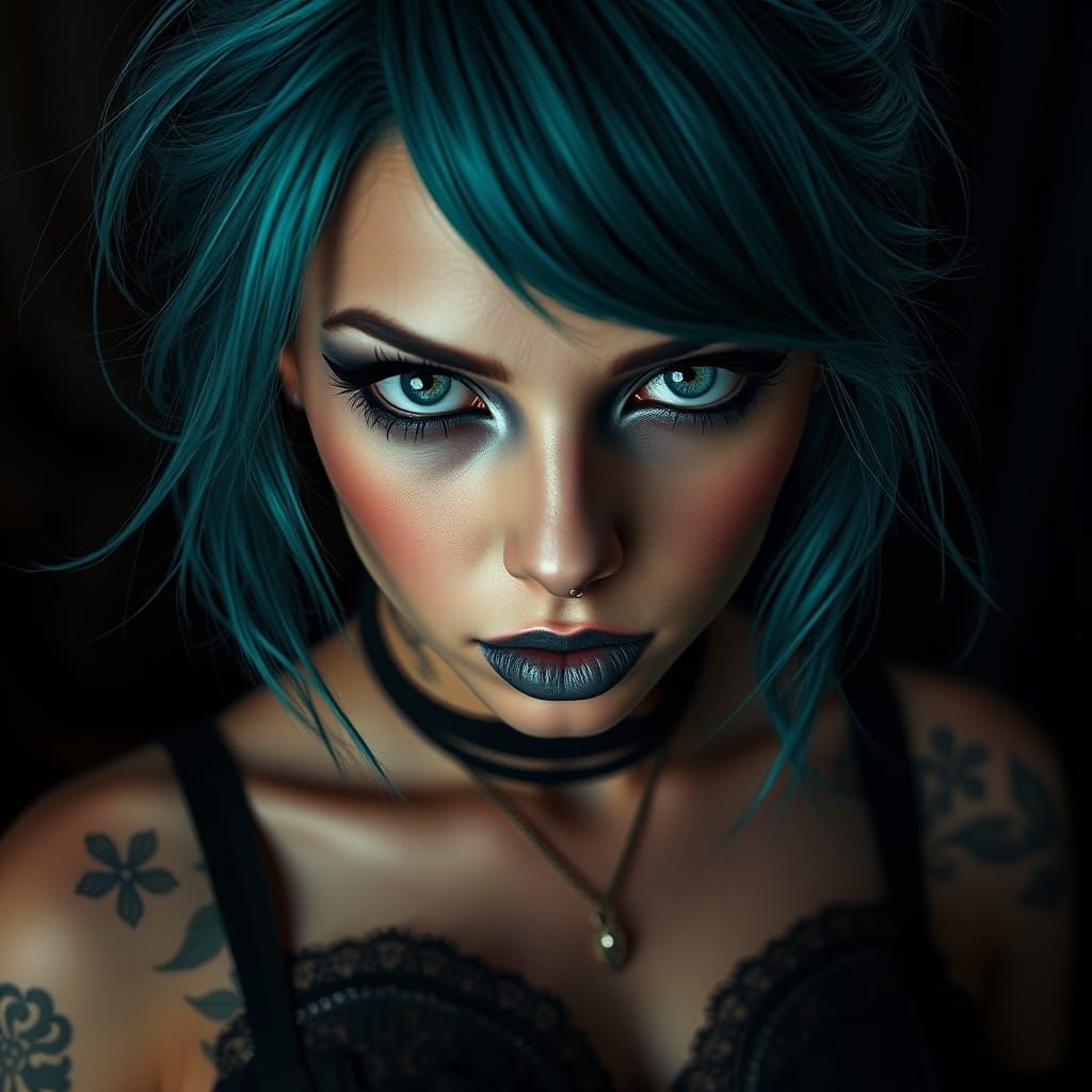 A photorealistic portrait of a young woman with striking teal eyes and vibrant teal hair, set against a dark moody background with intricate tattoos and detailed make-up, capturing a sense of quiet intensity and hyper-realistic detail.