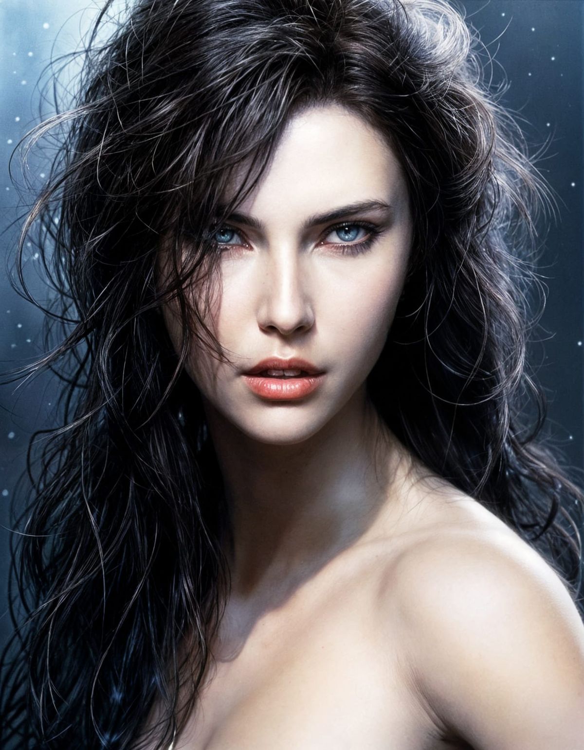 This image is a captivating portrayal of a woman in a nostalgic 80s art style, blending the sensuality of live-action with the vibrant flair of the era's iconic artists.