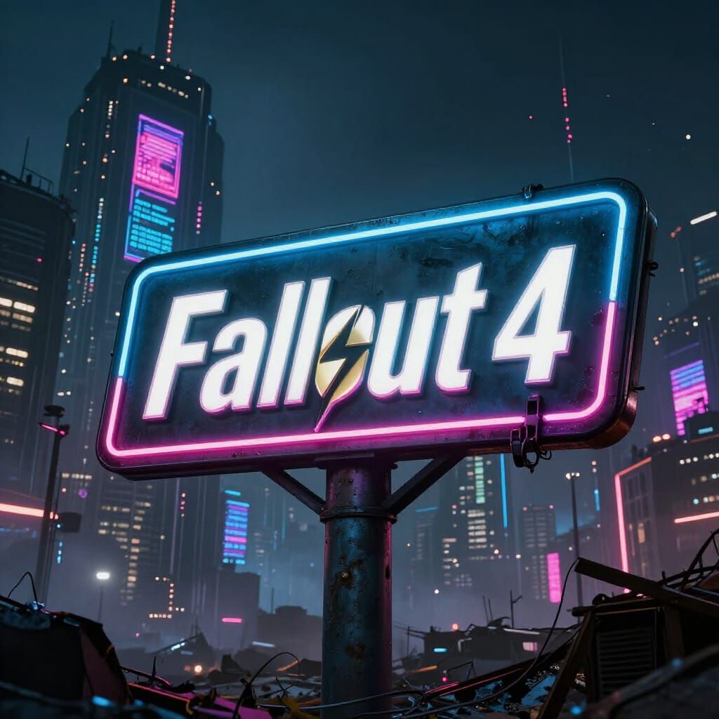 This image displays a weathered Fallout 4 sign with neon lights in a dark, rainy cityscape. It features a cyberpunk aesthetic with glowing accents and a dystopian mood.