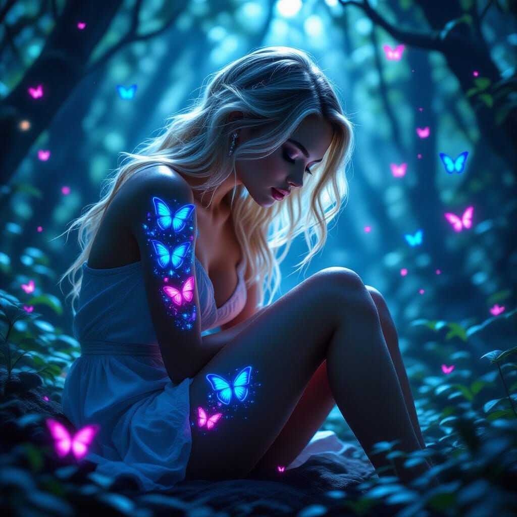 A striking picture of a woman with a glowing tattoo of butterflies on her thigh. The fantasy forest scene features dynamic lighting, ethereal light particles, and a hyperrealistic, intricately detailed aesthetic. The piece is reminiscent of art nouveau.
