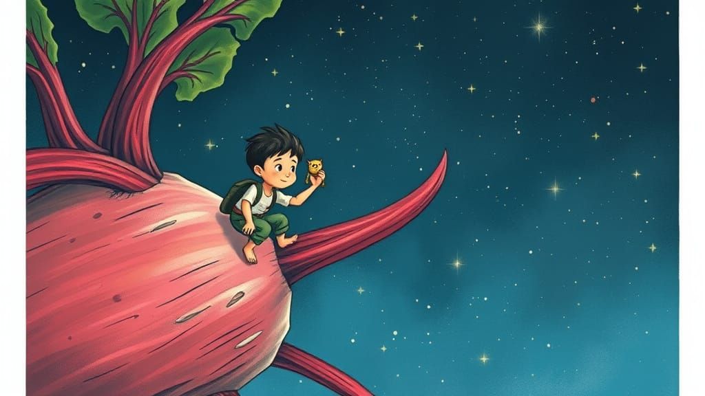 This image shows a young boy climbing a large, old, blue rhubarb plant. He's holding a creature in one hand as he ascends, set against a dark, star-filled sky.