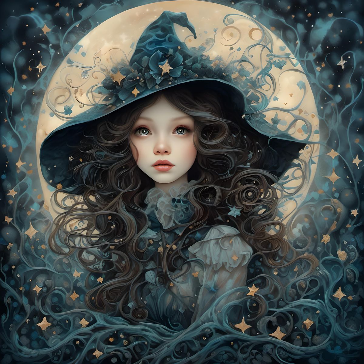 <lora:SuperHyperrealism:1.0> Extremely detailed cinematic film still photography of portrait of a beautiful girl on a swing, stars, Insanely Detailed Mixed-Media Photography, night, glittering stars scattered about, Silhouette of a witch flying on a broom across the moon, Trevor brown style, (Pop surrealism ...