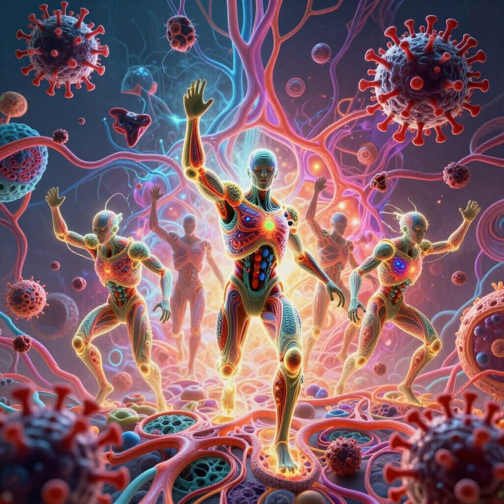 This image depicts stylized killer T cells as glowing warriors, celebrating victory over viral foes amidst vibrant biological systems in an epic concept art style.
