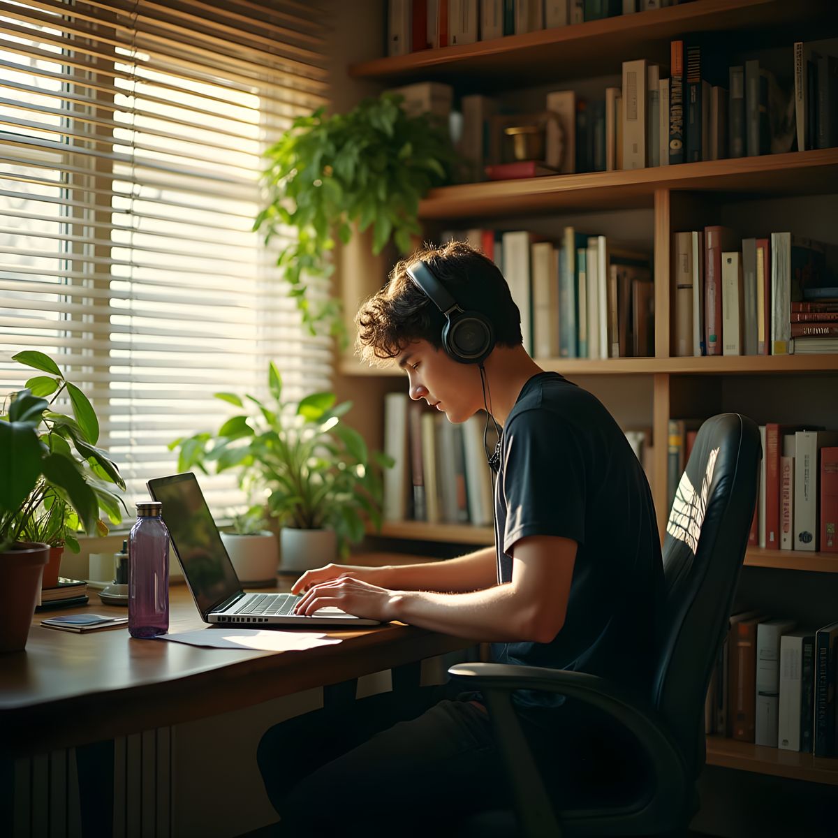 This image shows a young professional typing away in a modern coworking space, surrounded by books, plants, and warm natural light. The scene exudes productivity and calm focus.