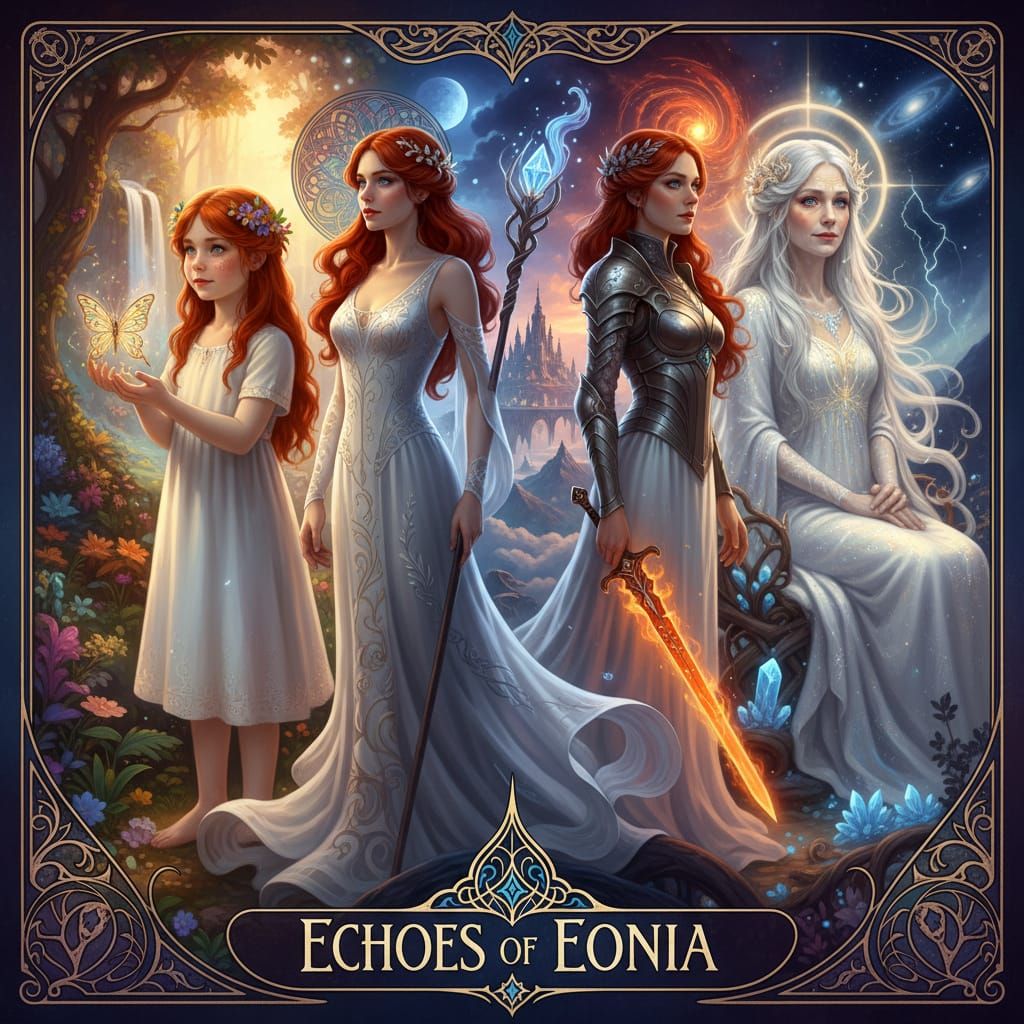 This image showcases a woman's life journey through four distinct ages, rendered as a detailed matte painting with ethereal lighting and vibrant gradients.