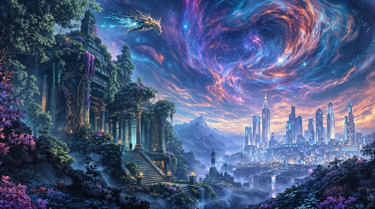 A painterly digital artwork depicting a surreal dreamscape where ancient temple ruins and a futuristic city converge under a swirling nebula, featuring a cybernetic dragon soaring between realms.