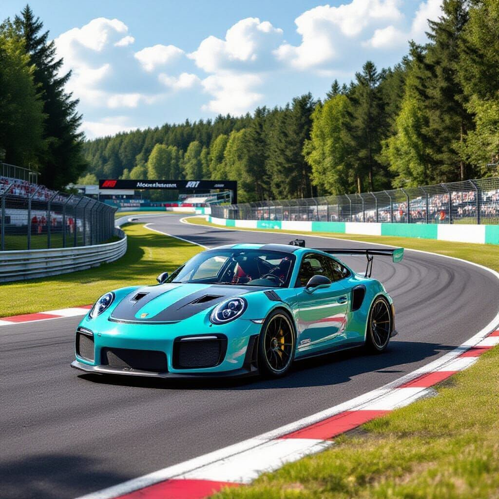 This image shows a turquoise Porsche 911 GT2 RS racing on the Hockenheimring track in Germany. Sunlight glints off the car's surface, with vibrant, dynamic aesthetics.