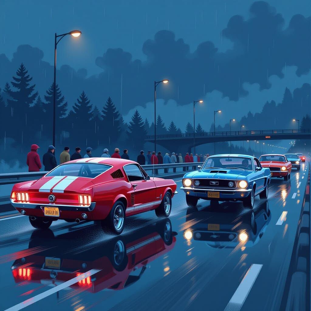 This image shows a high-speed race between a red 1967 Mustang and a blue 1968 Ford Falcon on a wet highway at night. The scene is rendered with a retro-futuristic aesthetic and a vibrant color palette.