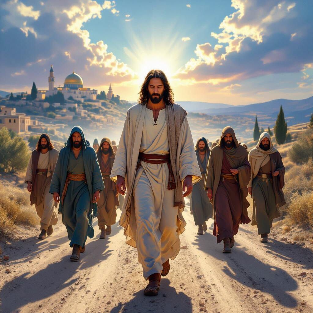 This hyperrealistic image depicts Jesus and his apostles walking toward the viewer on a dusty road, leaving Jerusalem. The scene features dramatic lighting and intricate details, evoking a sense of an epic, divine journey.