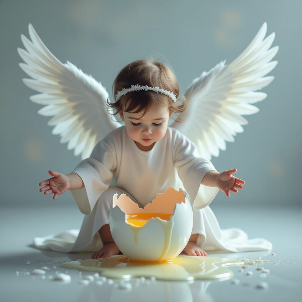 This image shows a one-year-old angel emerging from a cracked egg, set against a muted backdrop. Rendered as a hyperrealistic oil painting, the artwork features dynamic lighting and a triadic color scheme.