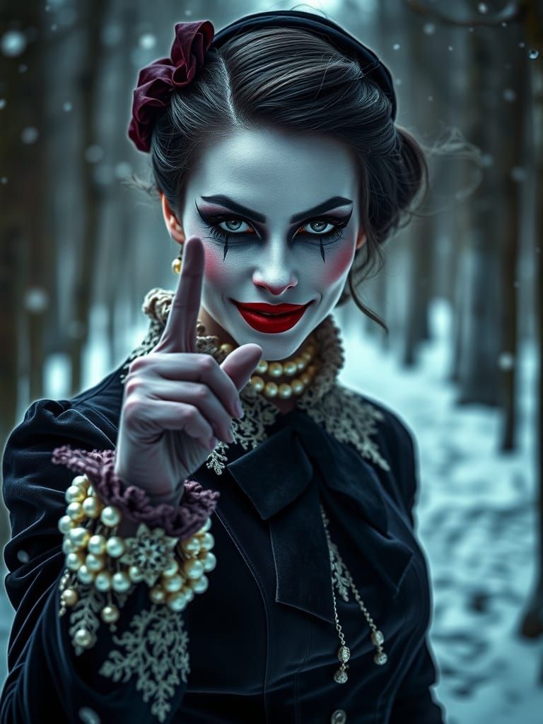 This image shows a harlequin in velvet Victorian clothing. Lace and pearls adorn the attire, and a sinister smile is painted on the face. The scene is set in a winter forest as a hyperrealistic digital artwork.