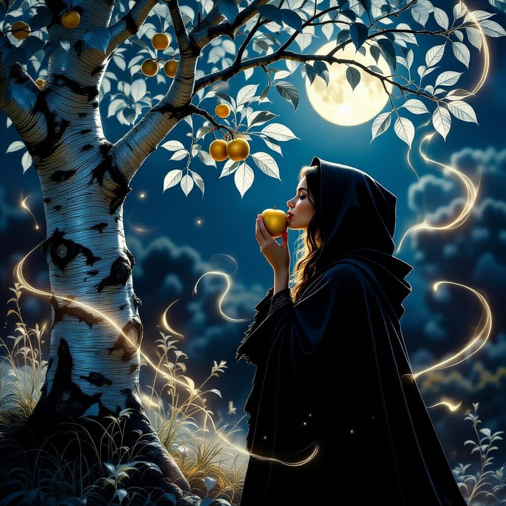In the moonlight, a young woman in a tattered cloak stands beside a tree with silver bark and shimmering silver leaves. Golden apples grow from the trees. A woman in a tattered cloak takes a bite from the apple.