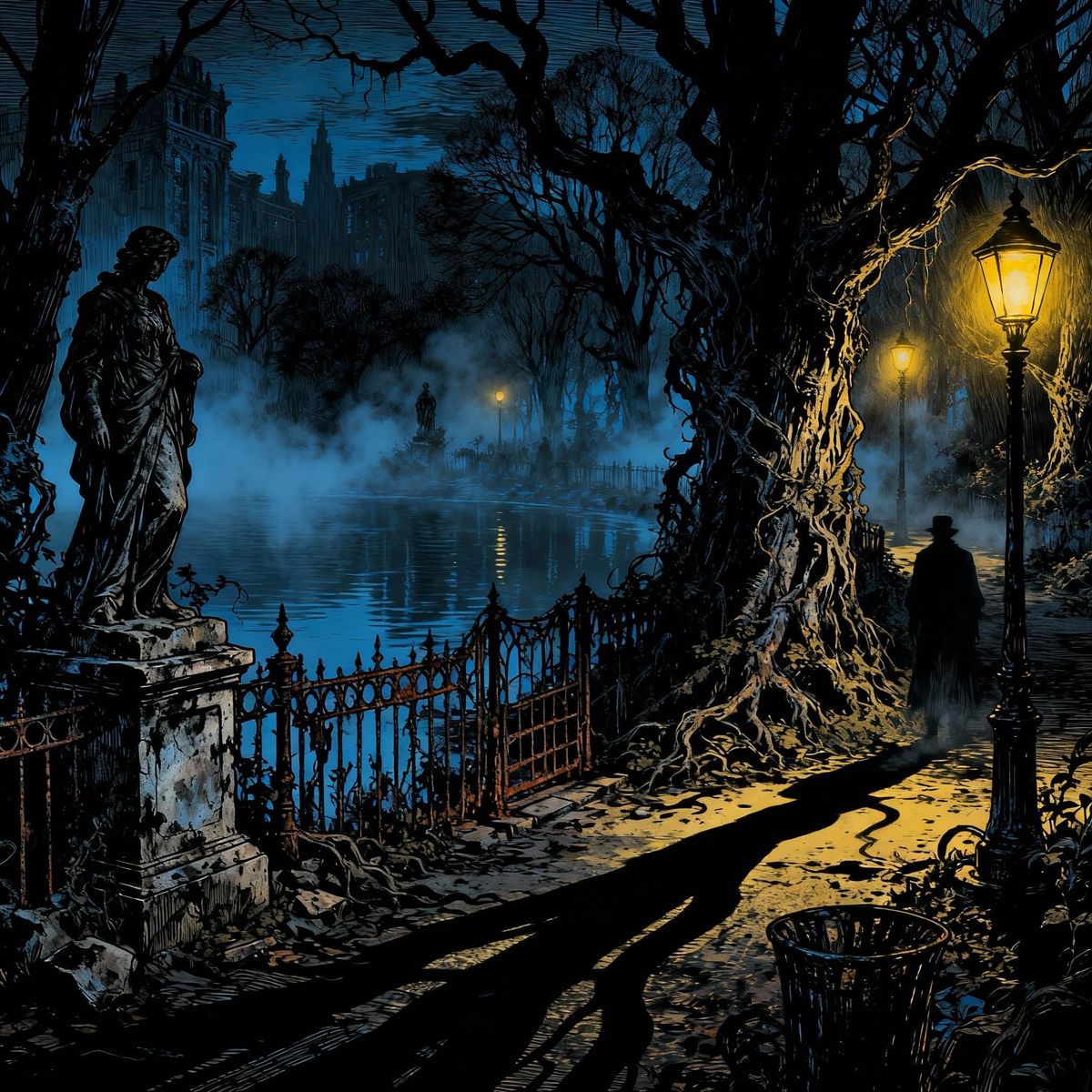 This image depicts a Victorian city park rendered in the dramatic, detailed style of Gustave Doré, evoking a sense of dark fantasy and intricate linework.