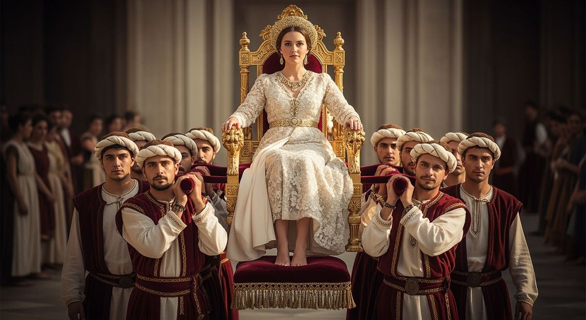 This image shows a Roman Empress being carried in a grand procession on a golden throne by twelve servants. Shot with soft bokeh and warm lighting, evoking high-end photography.