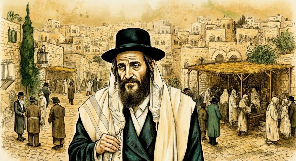 This image shows a Jewish man in traditional clothing in the Meah Shearim neighborhood during Sukkot. The scene is rendered in sepia tones with ink outlines and splashes of earthy colors, in the style of emotive illustrations and dreamy watercolors.