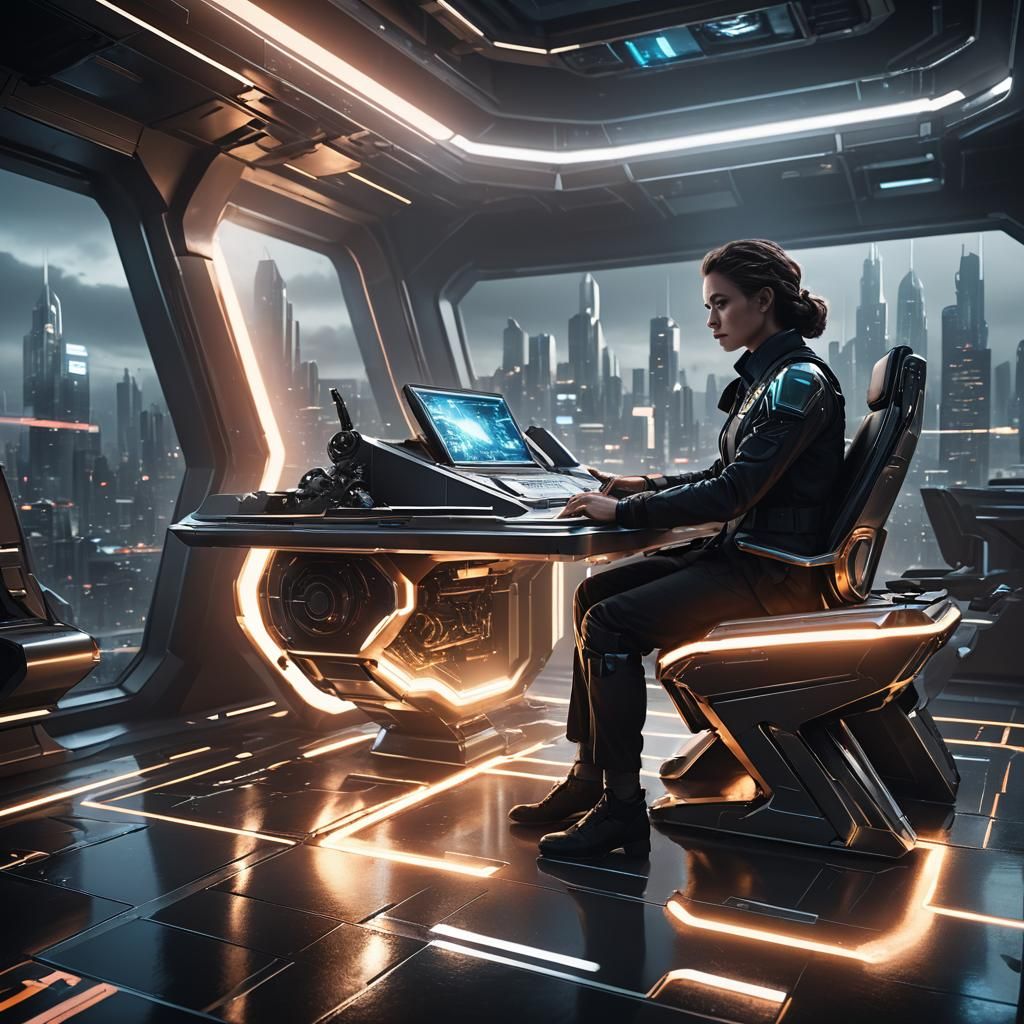 A futuristic personnel office scene with a person at a sleek desk. The image blends photorealism and digital art, showcasing intricate mechanical props, neon accents, and polished metallic surfaces. A cinematic, moody atmosphere enhanced with warm highlights.