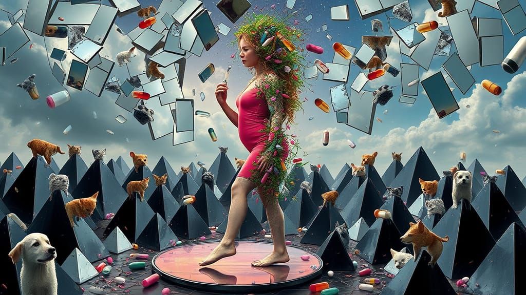 A surreal, dreamlike scene of a woman composed of vibrant pills, tablets, and capsules, set amidst a landscape of miniature ecosystems and shattered mirrors, reflecting a world of distorted realities.