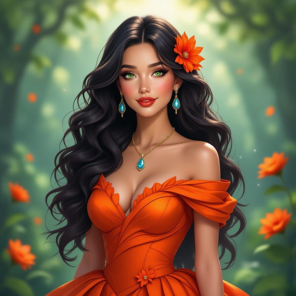 A striking picture of a raven-haired woman in an orange petal dress. The digital drawing features intricate details, vibrant colors, and a sensual, ethereal aesthetic reminiscent of fantasy art.