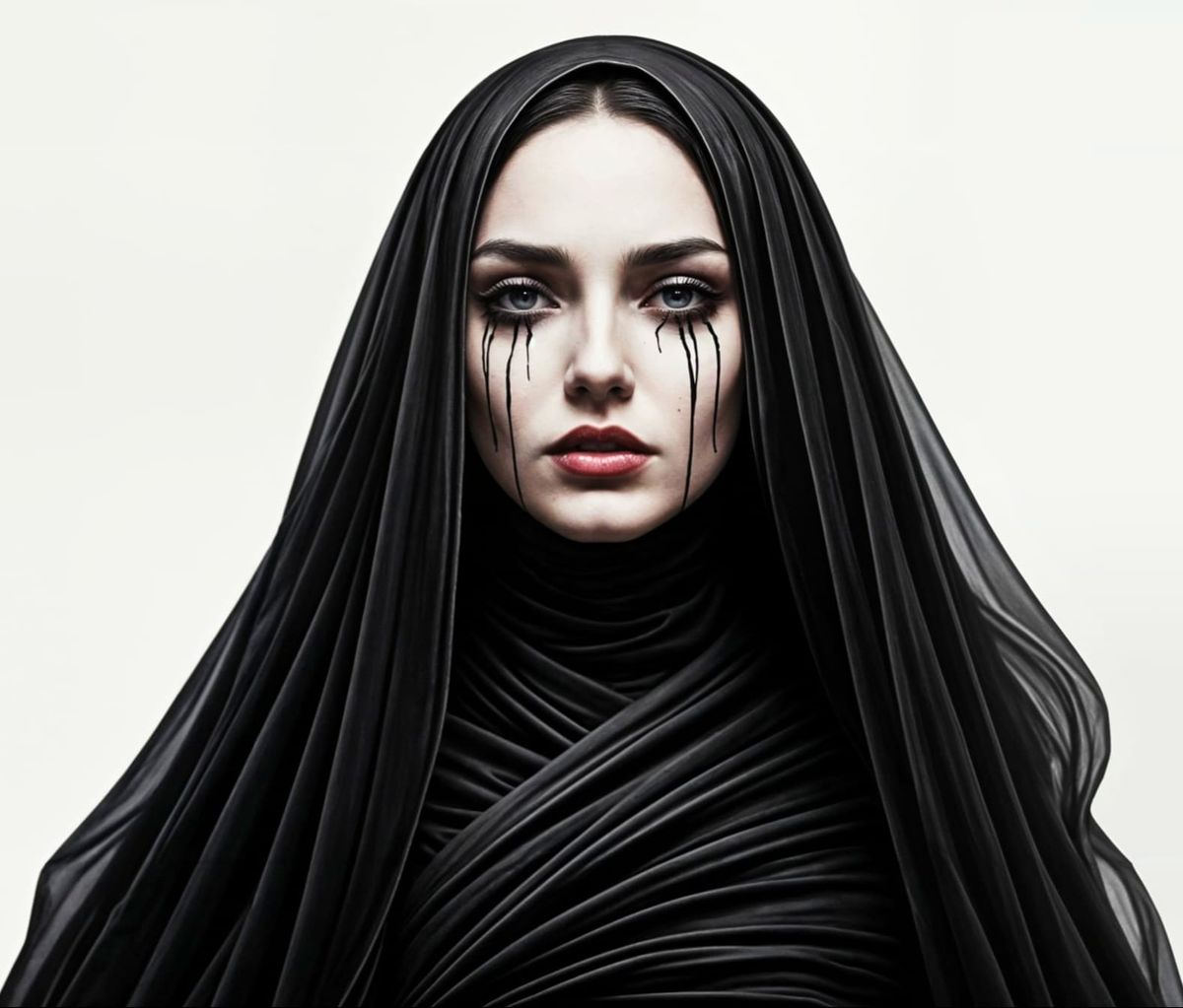 A dramatic image of a woman in a formal black dress, veiled and crying in a cinematic, monochromatic setting with a pop art aesthetic