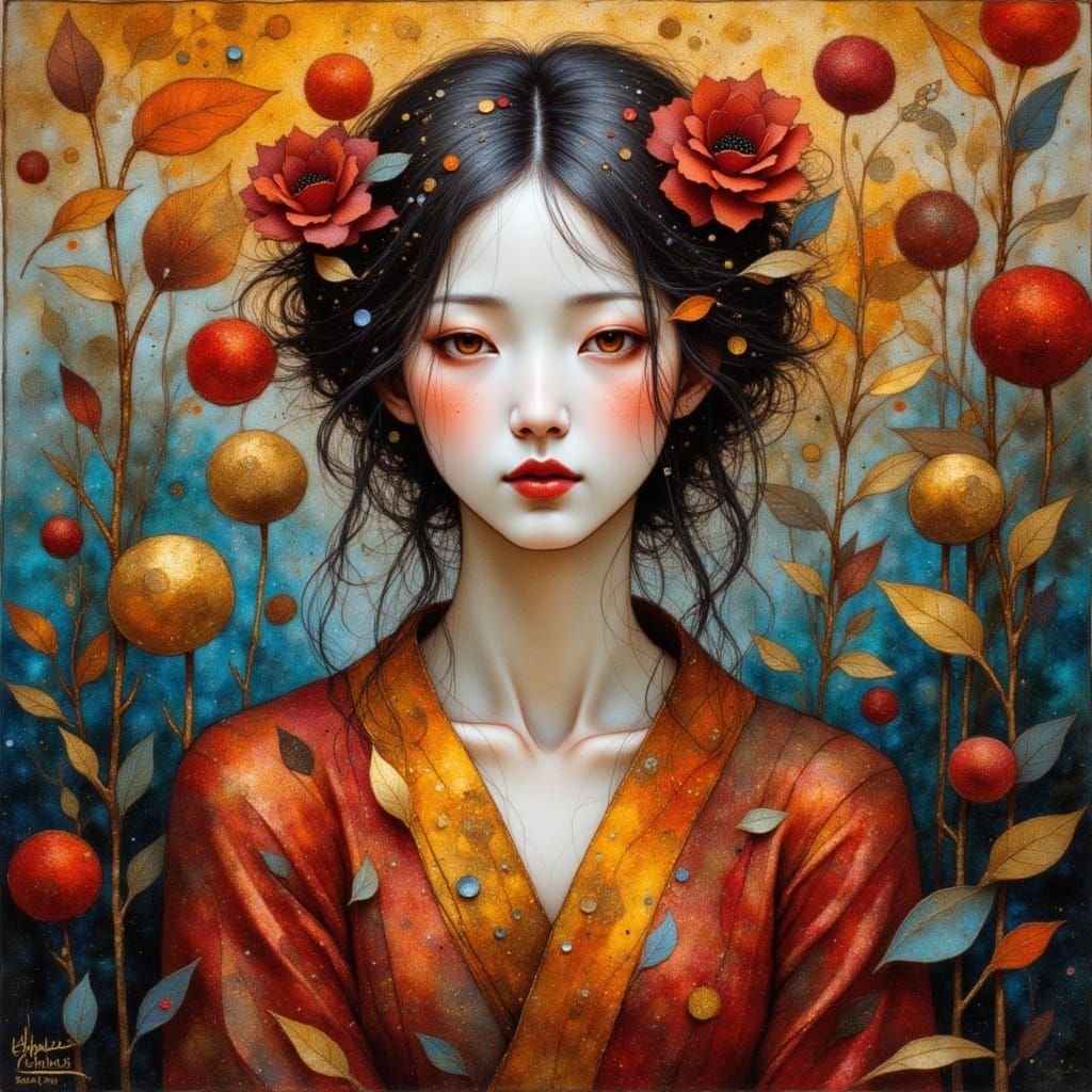 This image shows a nature goddess in an art nouveau style. The color palette features orange, burgundy, gold and teal hues to create a vibrant and ethereal scene.