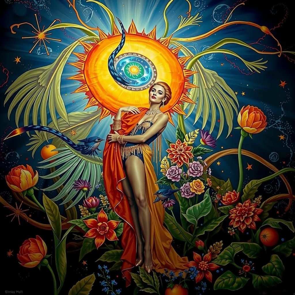 This image features a background with vibrant psychedelic oranges, reds, purples, and greens in floral and abstract patterns, evoking tropical heat and cosmic mystery. Accents of gold add regal punctuation.