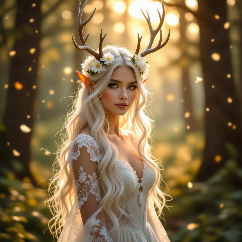 A hyperdetailed fantasy portrait of an ethereal elf woman with deer antlers and flowers, standing in a sunlit enchanted forest with glowing particles. Rendered with a dreamy fairycore aesthetic and soft focus.