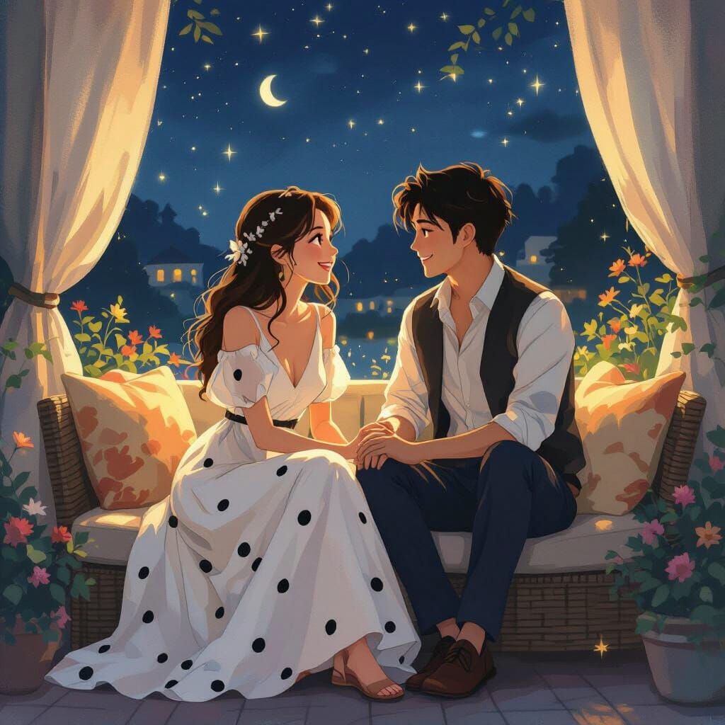 This image captures a couple sharing a happy conversation on a velander at night. The woman wears a white dress with black polka dots, rendered with soft, warm lighting and delicate textures.