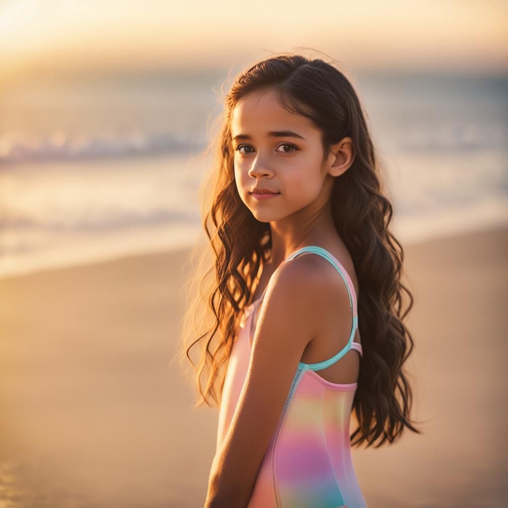 A portrait of a young woman on a beach at sunrise. Captured with soft, warm light and pastel colors, the image evokes a summer vibe with a shallow depth of field.