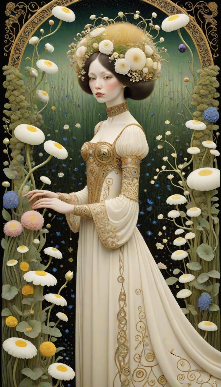 This image displays a realistic enchanted garden, inspired by the decorative and symbolic styles of influential artists.