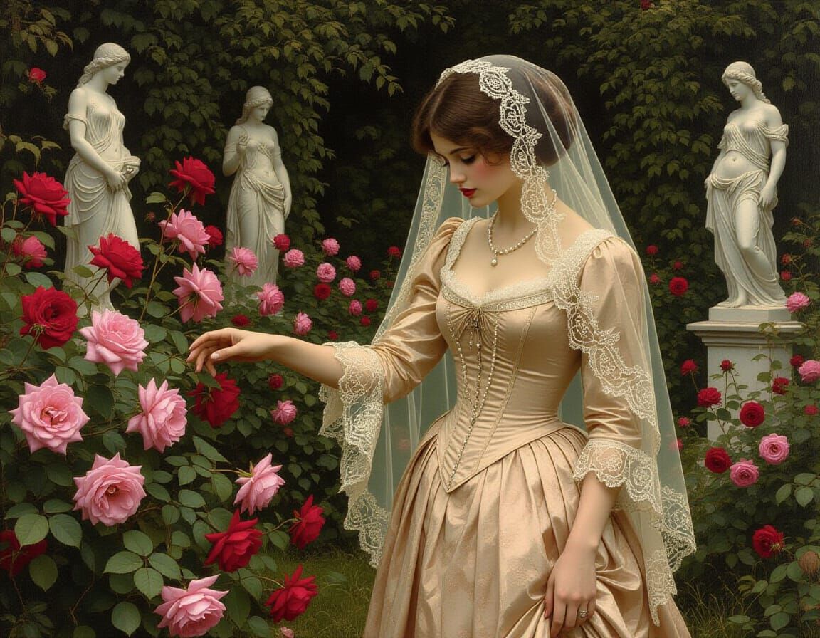 This image shows a countess in a decaying rose garden, her face veiled. She wears a faded silk gown. The garden is overgrown, statues crumble, and fountains are dry. The image is rendered in a dark romanticism style.