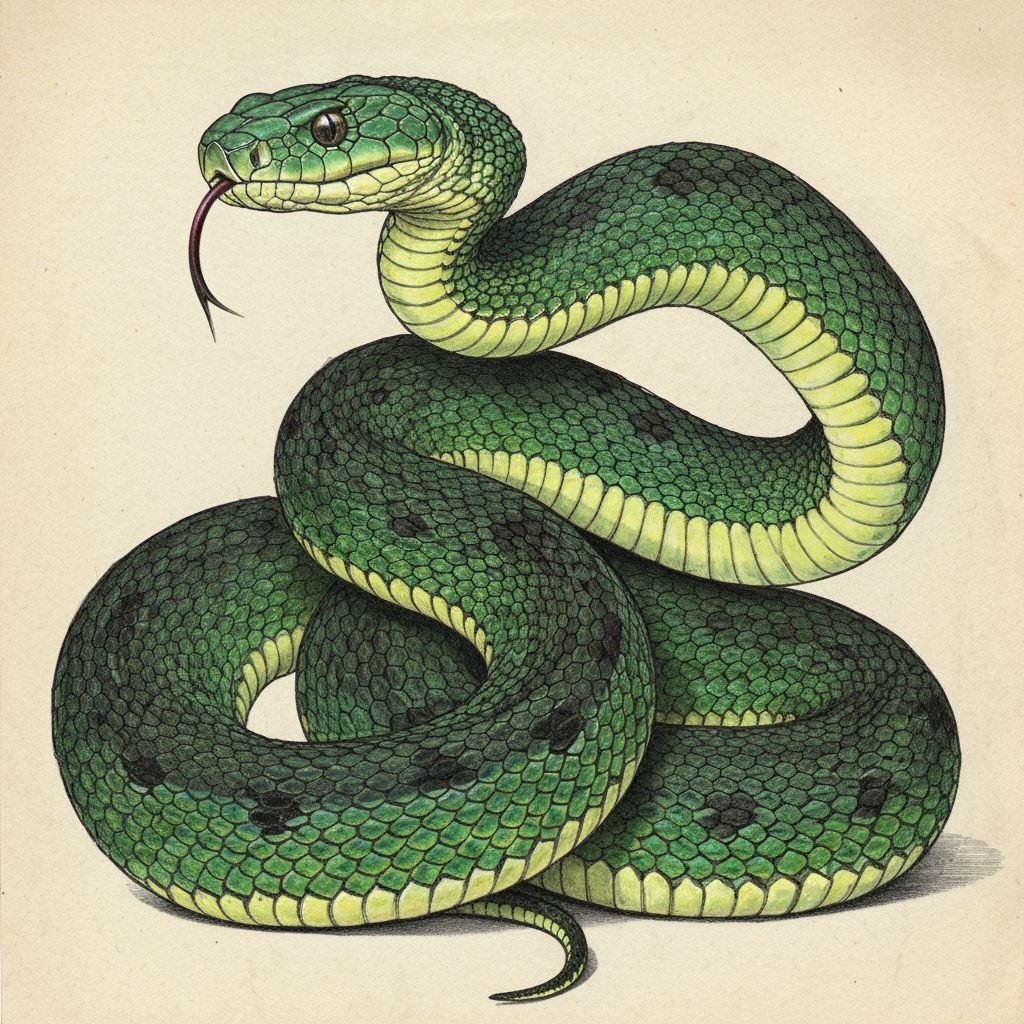 This image shows a detailed sketch of an Australian inland taipan snake coiled in a dramatic pose. The artwork captures the snake's vibrant colors and intricate patterns with delicate shading techniques and a sense of depth.