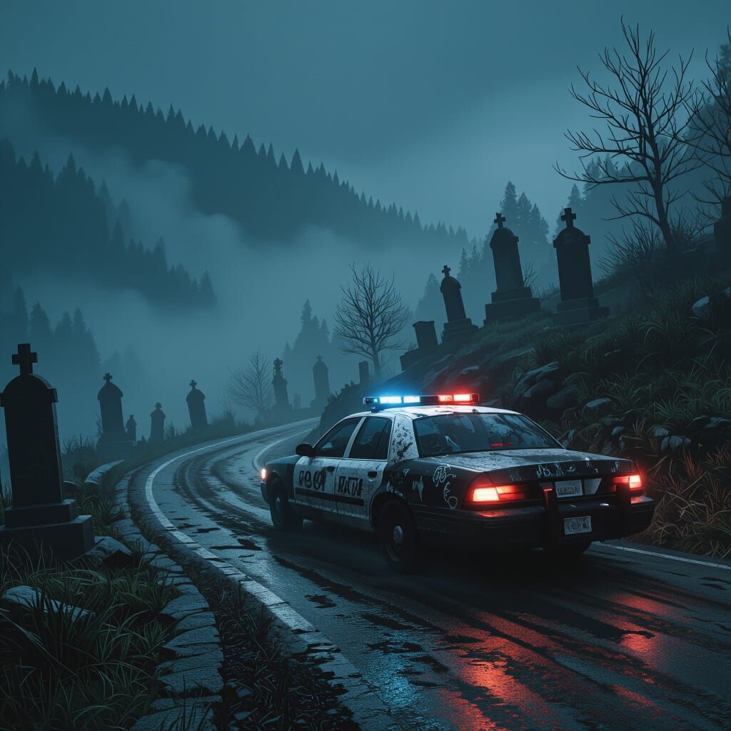 This image shows a mud-covered police car speeding along a mountain road next to an abandoned cemetery, all shrouded in thick fog. The scene is rendered as detailed matte painting.