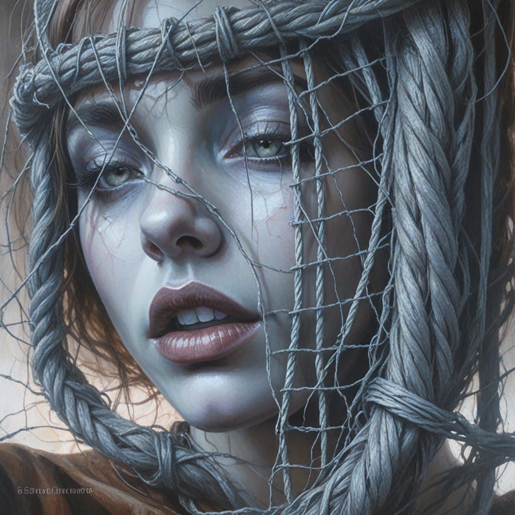A haunting oil painting portrait of a girl's face, entwined with rusty ropes and nets, set against a dark, muted background with warm golden light and rich, bold brushstrokes.
