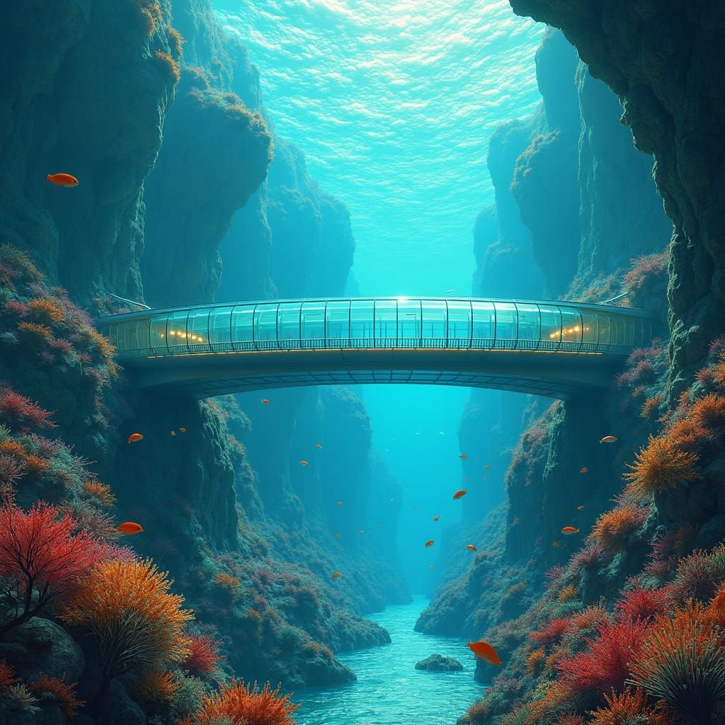 A stunning underwater tunnel of glass teeming with sea life supports a modern bridge. The scene is softly lit, reminiscent of futuristic concept art and imaginative industrial illustrations.