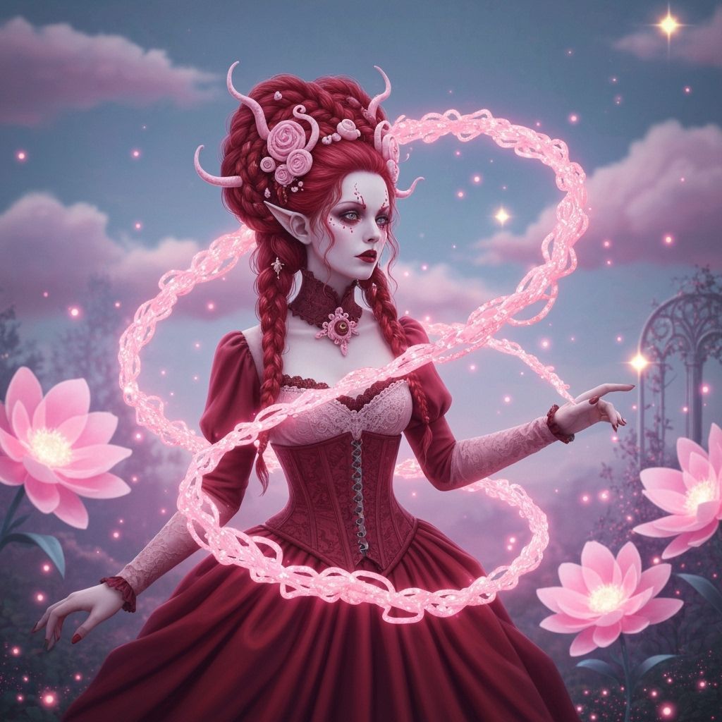 This image shows a gothic woman with red hair surrounded by pink, glittery pasta in a surreal, dreamy atmosphere. The artwork blends gothic and whimsical styles, with pastel pinks and deep reds in a soft, diffused light.