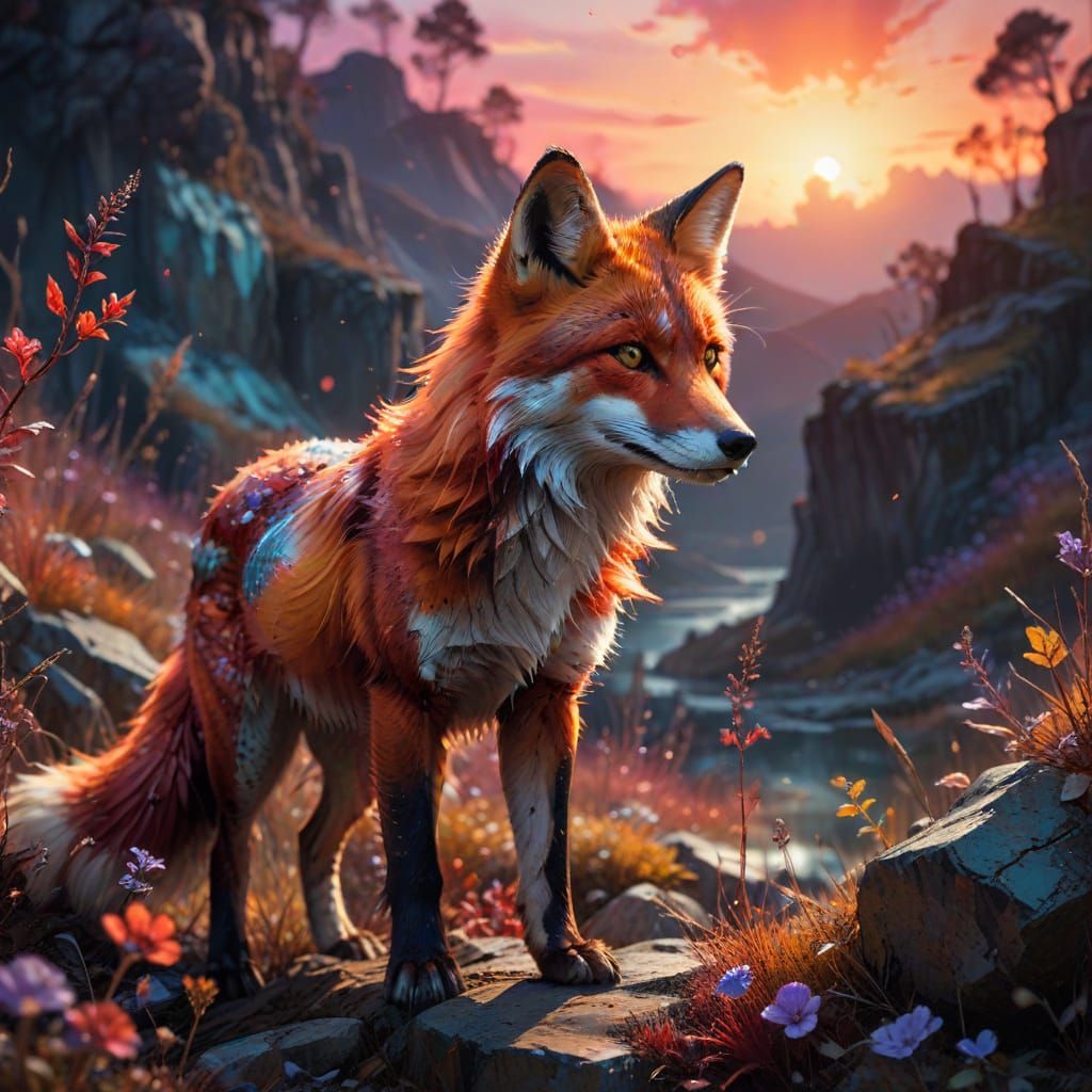 This vibrant digital watercolour illustration captures a majestic crimson fox in a breathtaking fantastical landscape, bathed in warm pastel hues of a sunset. With intricate stylized details and deep shadows, this masterpiece showcases the perfect blend of realistic and fantastical elements.
