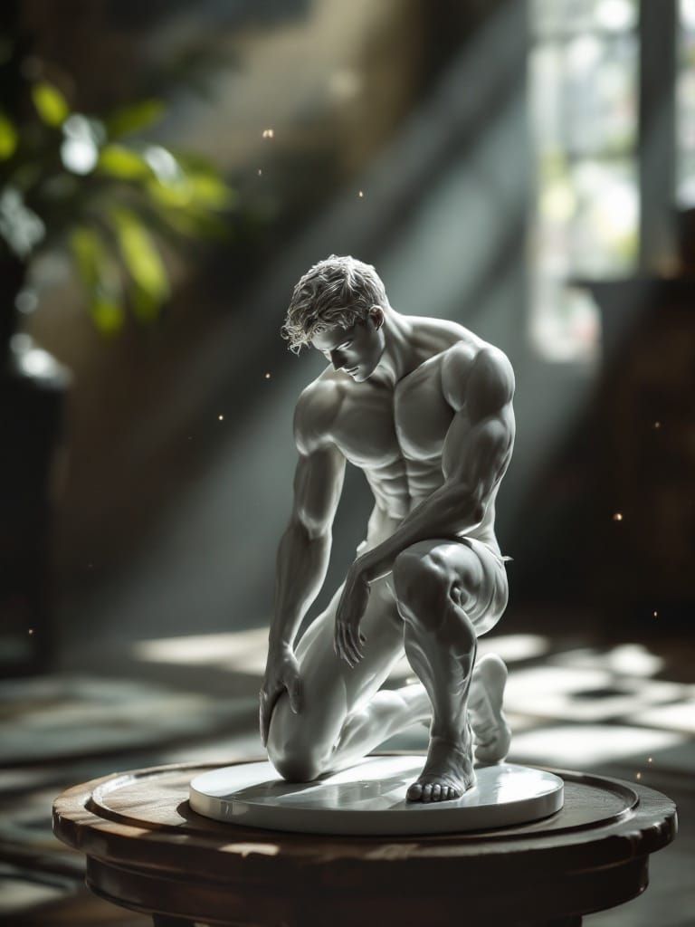 A chiaroscuro image of a delicate porcelain figurine depicting a muscular, kneeling man. The figure is set on a dark wood pedestal in a hall illuminated with magical, natural light.