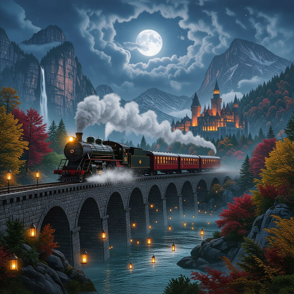 A vintage steam train travels across a stone bridge in a cinematic fantasy landscape. The autumn forest and river below are lit by lanterns and moonlight, creating a magical and immersive scene.