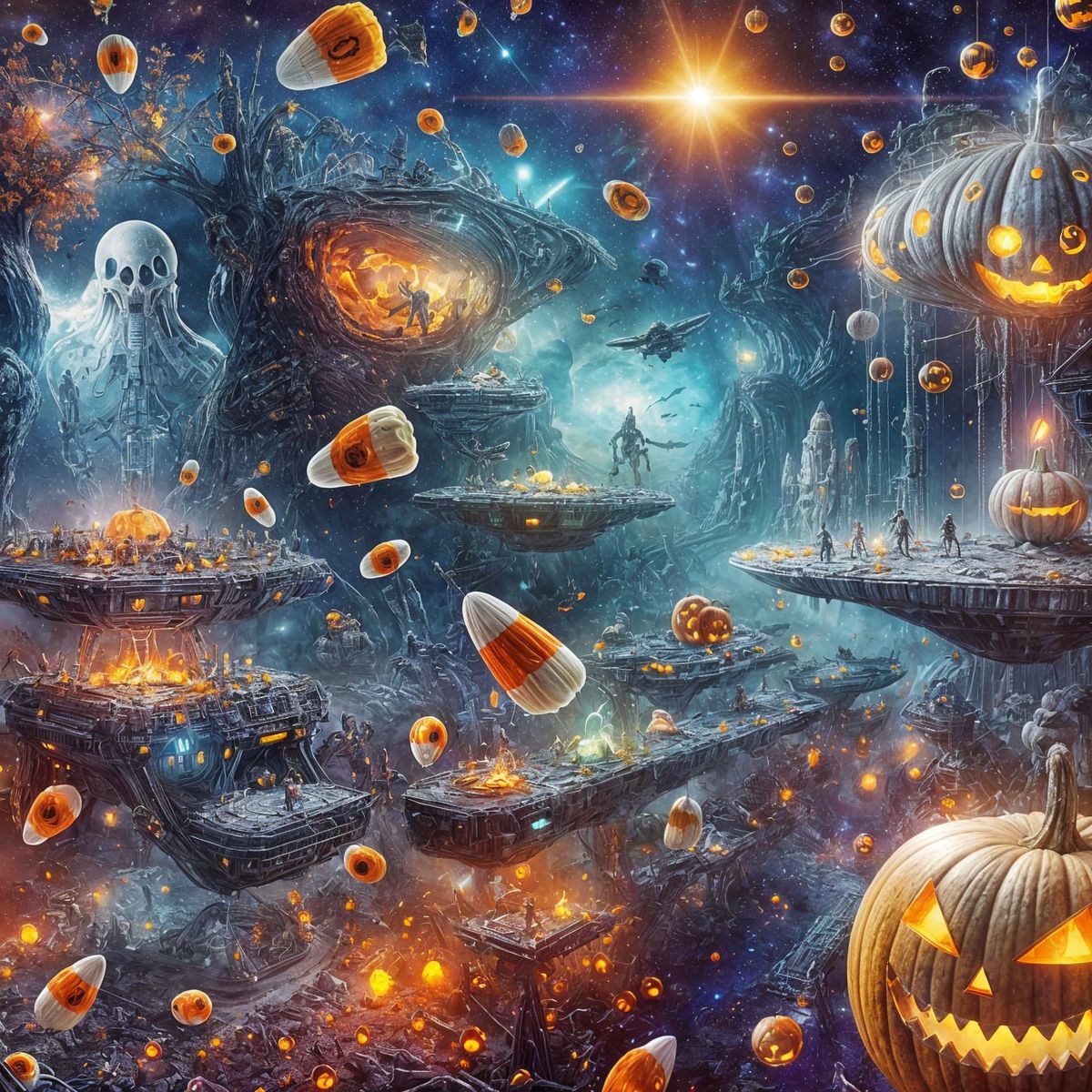This image shows a science fiction Halloween scene with spaceships and carved pumpkins floating in space. An extraterrestrial being observes the scene, which is filled with cosmic candy corn and otherworldly elements in a maximalist style.