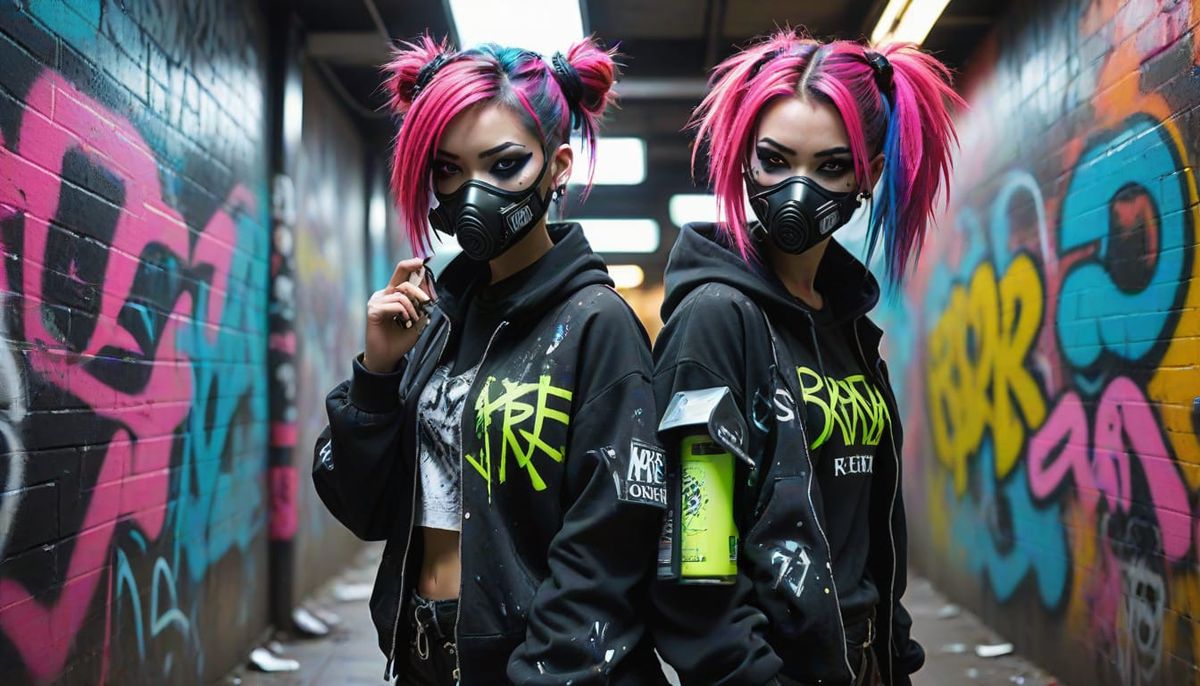 This image shows a young street artist in an oversized urban outfit, captured mid-action. The scene features a graffiti-covered wall with neon lights, enhancing the raw, electrifying atmosphere of street culture.