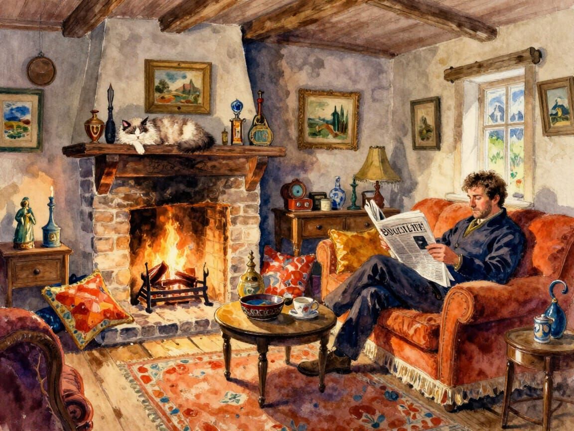 This image shows a warm, cluttered Baltic living room with antiques and a sleeping cat, rendered in a loose, expressive watercolor style with bleeding colors.