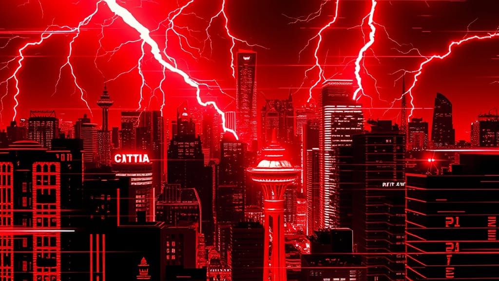 This image showcases a glitch art style with severe digital artifacts in red, white, and black. A brightly glowing red city is set against a black background, punctuated by white lightning strikes.